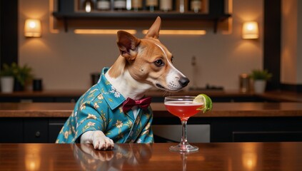 Stylish Dog in Floral Shirt Sits at Bar Counter With Cocktail Although it is not entirely identical to the original prompt this shorter version conveys the same essential elements subject a dog