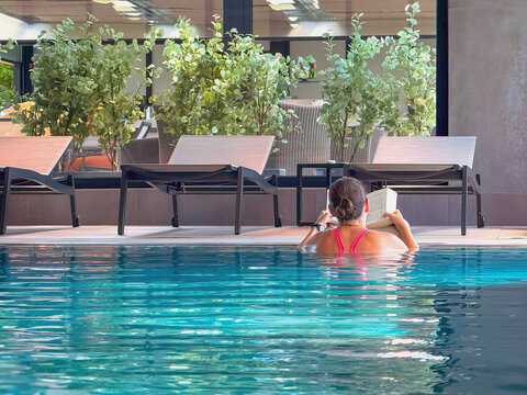 Woman in red swimsuit relaxing in indoor pool while reading book, surrounded by lounge chairs and green plants. Concept of relaxation, slow living, digital detox, self care, reading literature