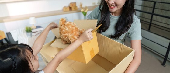 Unpacking joy. Mother and daughter sharing excitement while revealing a teddy bear from a box.