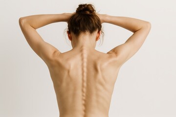 Back view of young woman with visible spine standing with hands on head against white background. Concept of spine health, posture awareness, musculoskeletal wellness, spinal alignment