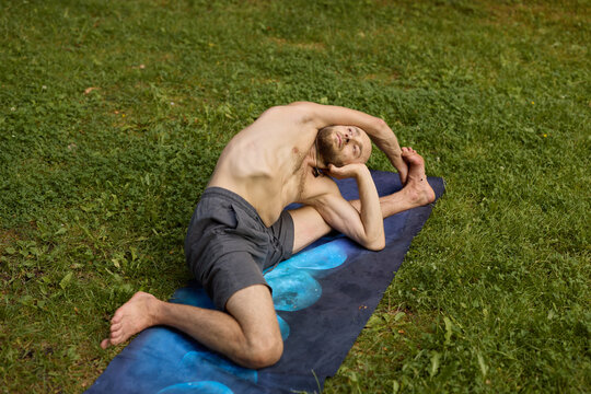Men stretching forward on yoga mats in studio focusing on alignment, flexibility, teamwork