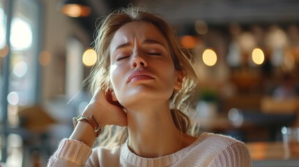 With a tired expression, a woman struggles with the discomfort of office syndrome neck pain, back pain, and a headache from hours spent at her desk  8K , high-resolution, ultra HD,up32K HD