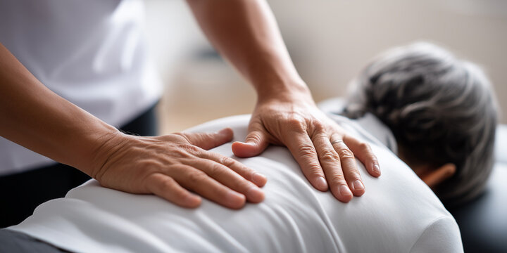 Physiotherapist assisting senior woman with neck and shoulder massage