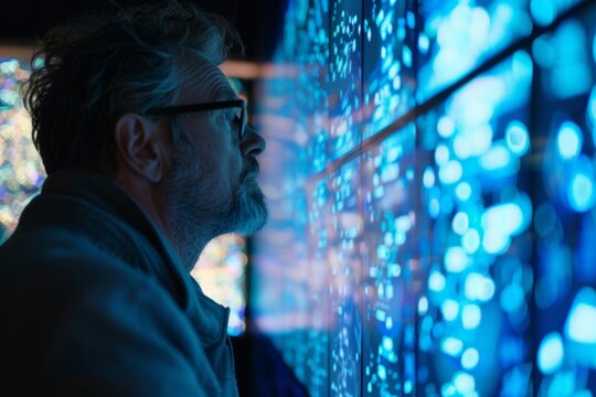 App display looking over a shoulder of a middle-aged man in front of a interactive digital board with a completely blue screen