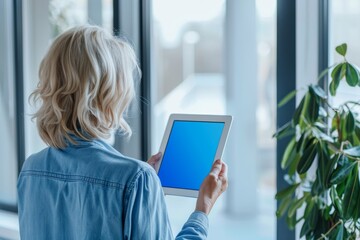 Showcase screen next to the shoulder of a mature woman holding a tablet with a completely blue screen