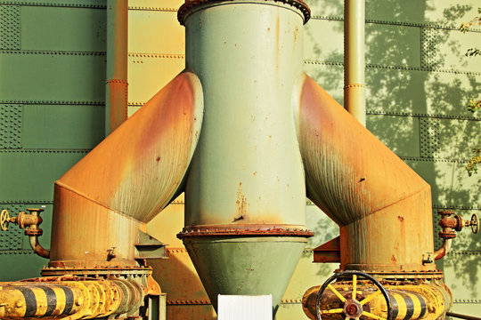 Breite Schultern, Rohre an einem Gasometer im Landschaftspark Duisburg, Deutschland