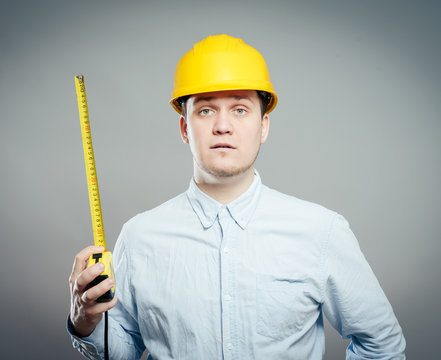 Young man close-up in a blue shirt and construction helmet on a yellow background holding a tape measure, measure something. Mimicry. Gesture. photo Shoot