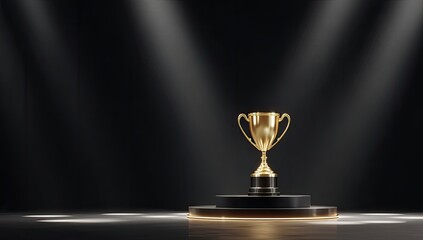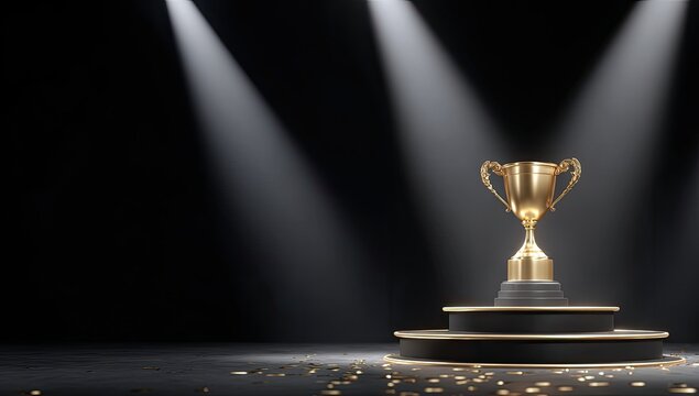 Golden Trophy Awards on Stage Illuminated by Spotlights for Champions