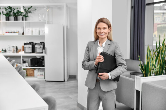 Happy real estate agent with leather portfolio indoors