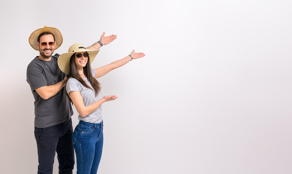 Candid beach selfie with stylish summer hats and popsicles