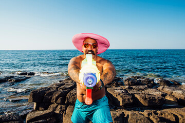 Woman wearing bikini and straw hat showing OK sign on balcony of beachfront hotel