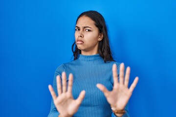 Young brazilian woman standing over blue isolated background moving away hands palms showing refusal and denial with afraid and disgusting expression. stop and forbidden.