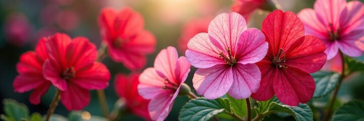 Large showy geranium flowers with prominent petals in shades of pink and red, large, petals, flowers