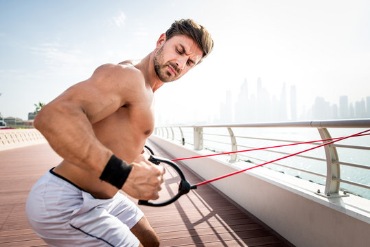 Athletic shirtless man showcasing his muscular abs during an outdoor workout, highlighting fitness, strength, and a healthy lifestyle.