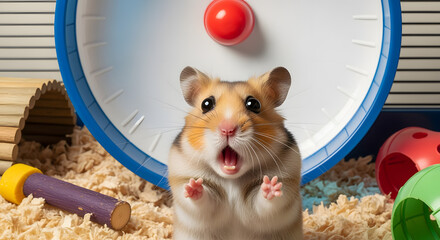 Cute Hamster Playing in Cage with Exercise Wheel and Toys in Bright Enclosure