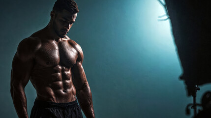 Fit man shows off muscular physique under studio lighting. Use: fitness app, gym marketing material.