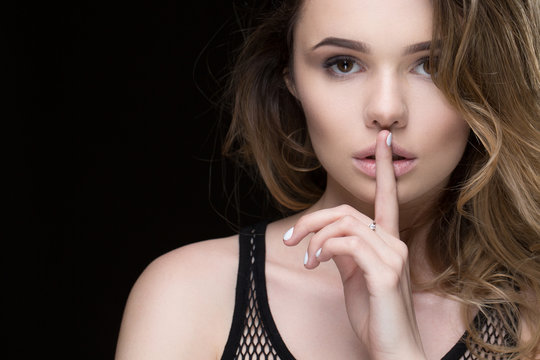 Her secret. Cropped closeup of a gorgeous young mysterious woman making shushing gesture with her finger to her lips on black background