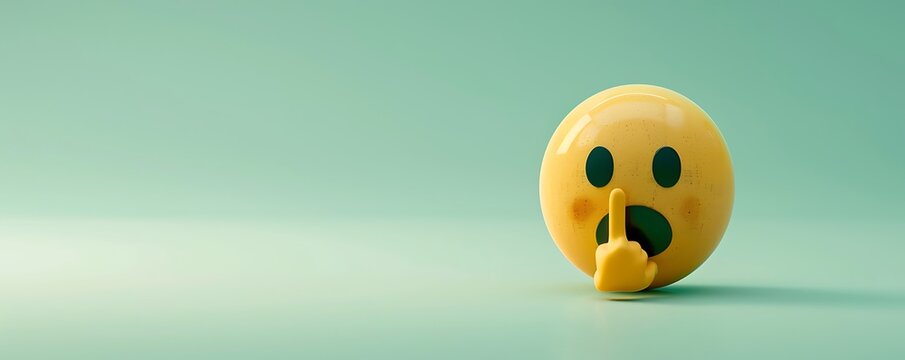 shushing emoji on a light green background with space for copy The emoji is yellow with a finger to its lips