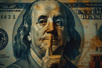Benjamin Franklin is shown on a dollar bill with a shushing gesture, emphasizing secrecy and discretion.