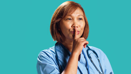 Close up shot of rigid strict BIPOC clinic manager shushing at camera, bothered by too much noise. Rigurous nurse holding quiet gesture finger to lips, isolated over studio background