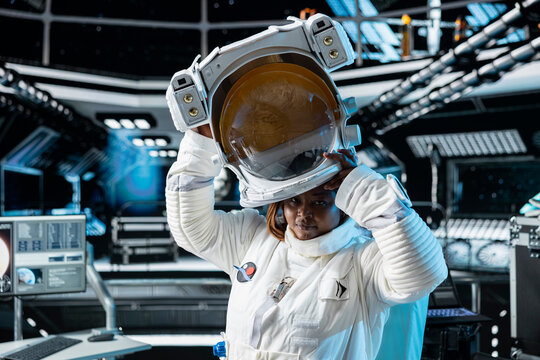 Portrait of female cosmonaut putting on cosmic gear helmet, preparing for planetary mission outside. African american woman in orbital station beginning landing procedures on solar system planet