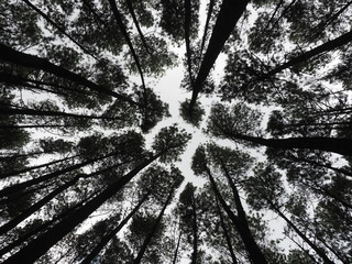 Ground-level perspective of a forest with trees showing crown shyness, their leaves barely touching, creating a natural mosaic in the sky