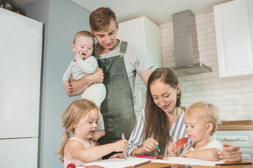 family smiling happily sitting together in the kitchen working and doing their children's homework. Family spending time together in kitchen