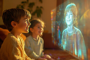 Two young kids mesmerized by a holographic projection of a cheerful boy coming from a high-tech gadget, discovering the wonders of modern technology at home