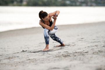 Yoga instructor practicing revolved side angle pose on the beach