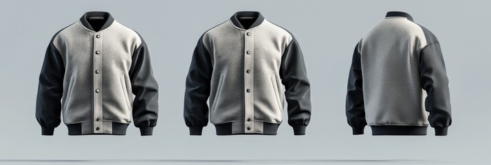 Jacket Mockup: Varsity Jacket in Front, Side, and Back Views with Blank Design. 3D Illustration