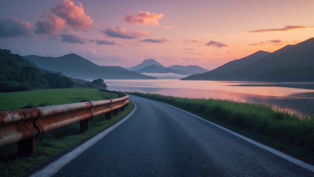 A photograph of the roadway adjacent to the dam featuring a sunset view.