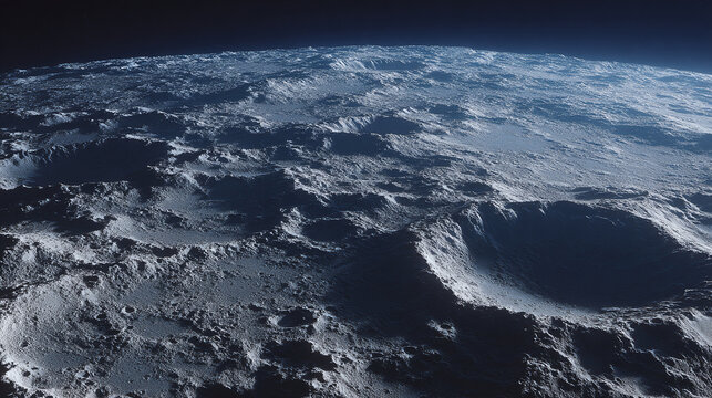 The Moon's surface revealing craters and geological features illuminated by celestial light. A captivating panorama of the lunar landscape, a reminder of the vast cosmos.