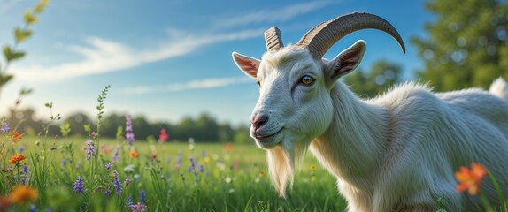 Goat grazing in a lush green meadow under a clear blue sky during a sunny day