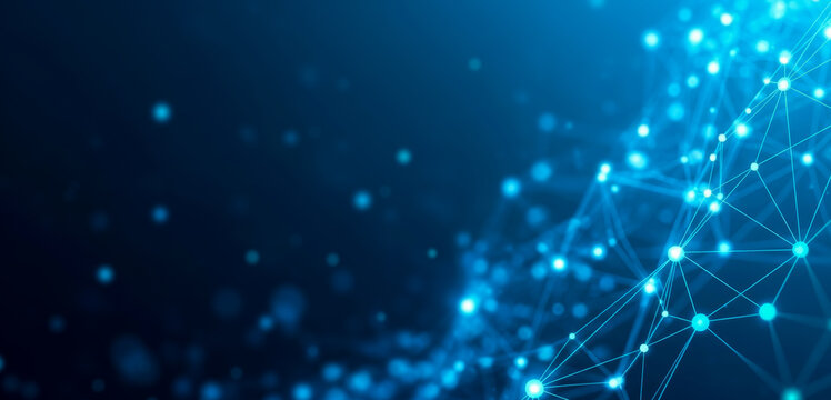 Abstract network of connected dots and lines on a blue gradient background with futuristic digital grid connections creating a sense of depth and technology innovation.