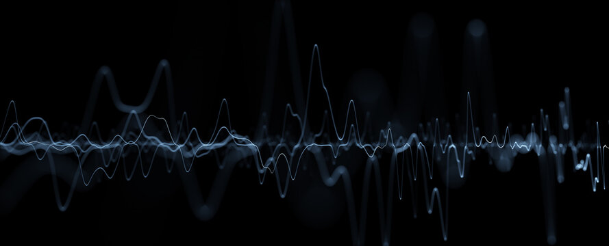 Abstract digital technology music equalizer detailed wavy lines oscillation on black background.