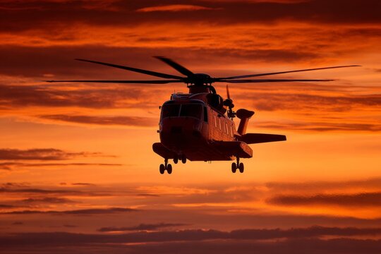 A Sikorsky UH-60 Black Hawk twin-engine, medium-lift utility military transport helicopter flying at sunset.