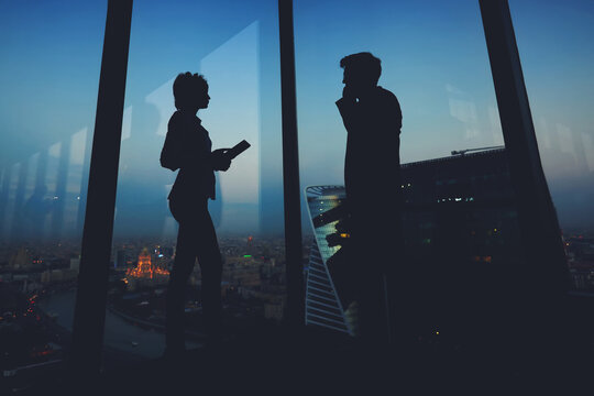 Silhouette of a two young business people standing in modern interior near big window, man entrepreneur having mobile phone conversation while his woman partner using digital tablet during work break
