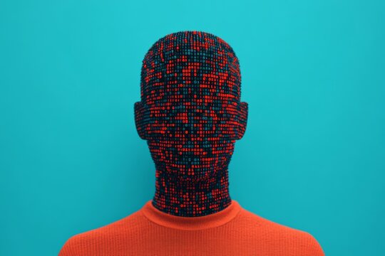 digital silhouette of a human head composed of binary code, illuminated against a vibrant orange background. This visual symbolizes artificial intelligence, data processing, and technological advance