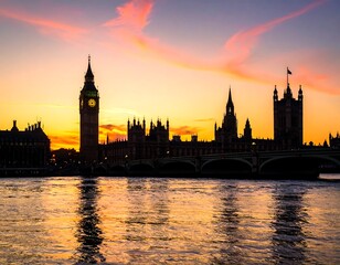 Stunning sunset sky with silhouetted cityscape over reflective lake