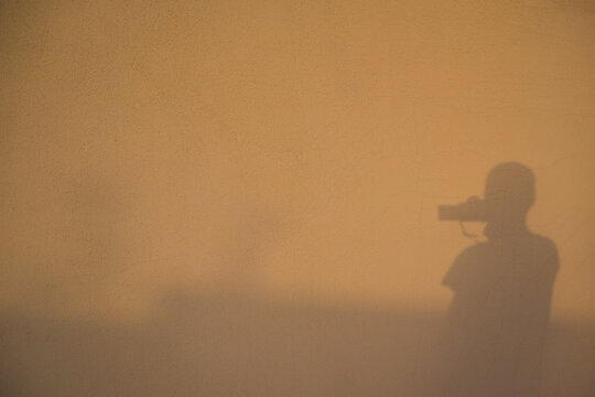 Shadows in a wall. Reflection / silhouette of the photographer taking photo of himself. Silhouette of photographer taking a photo