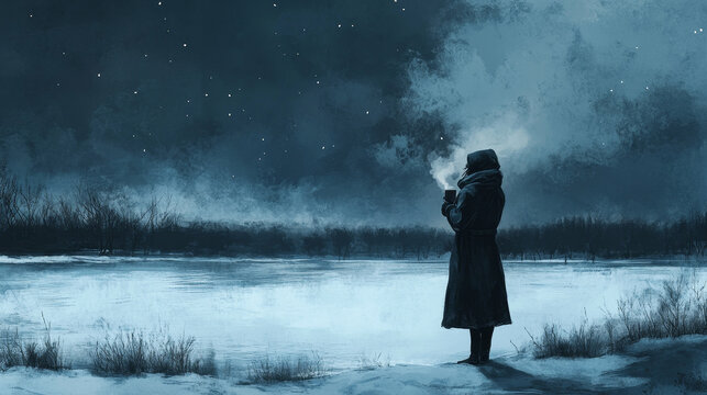 Silhouetted figure walking along twilight beach with golden bokeh lights overlay
