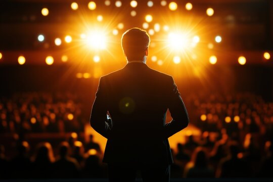 A silhouetted figure stands confidently before a radiant stage, illuminated by bright lights. The audience awaits, creating an atmosphere of anticipation and excitement for the performance ahead.