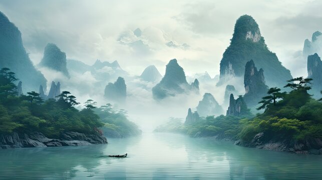 A serene landscape featuring a river winding through lush green forests under a soft, glowing sunrise.