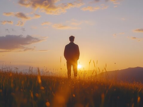 A person in traditional clothing stands on a sand dune at sunset in the desert landscape view