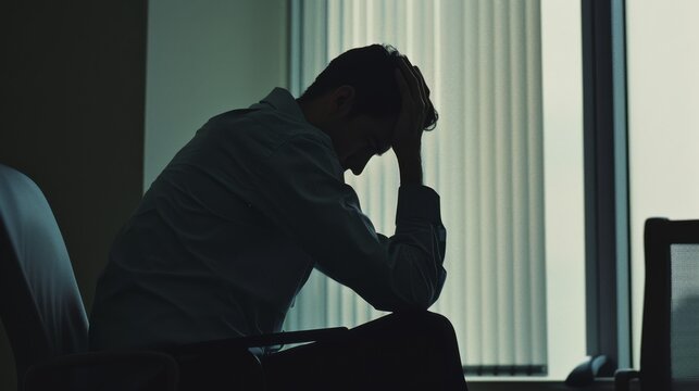 sad lonely thoughtful man silhouette sitting on a window windowsill and looking outdoors far away,
