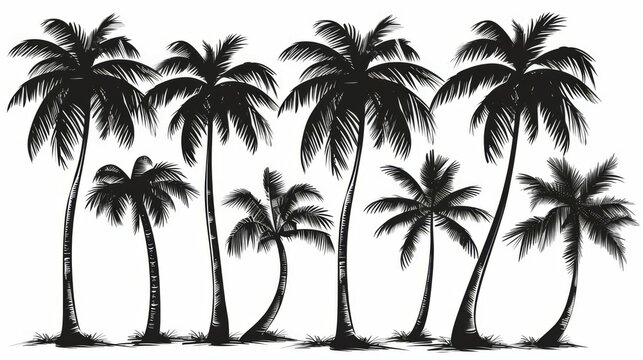 A hand-drawn illustration of a group of palm trees in silhouette against a white background, showing an artistic representation with a classic and timeless aesthetic style.