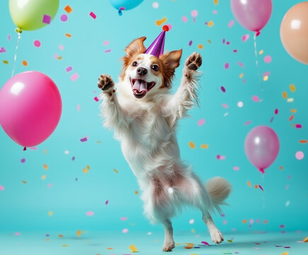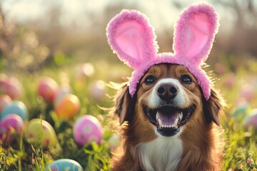 Happy dog in bunny ears playing in vibrant flowers with colorful Easter eggs outdoors