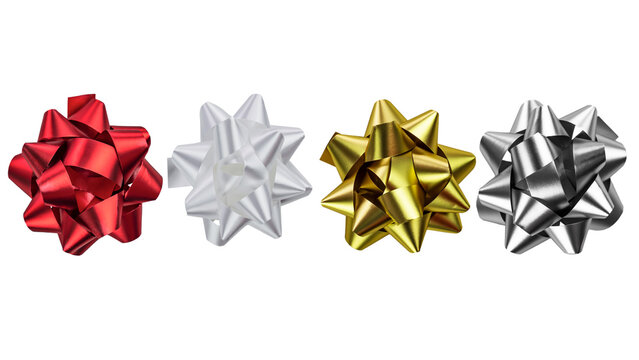 Gold bow ribbon  decor element package. Shiny golden, red, white and silver satin decorations gift present, holiday design, isolated white background. Symbol Christmas, New Year celebration, birthday