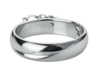 A wide, smooth, silver bangle with a small chain
