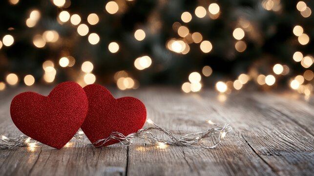 Two vibrant red paper hearts rest on a wooden table, set against a sparkling silver bokeh background, creating a romantic atmosphere